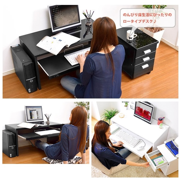 床にベタ座りして使用することが出来る、ある意味日本人向けのシステムデスクとなっています。 普段座椅子やクッションの上などでくつろぐことの多い人にとっては、その流れでパソコンもできるので便利かも知れないですね。