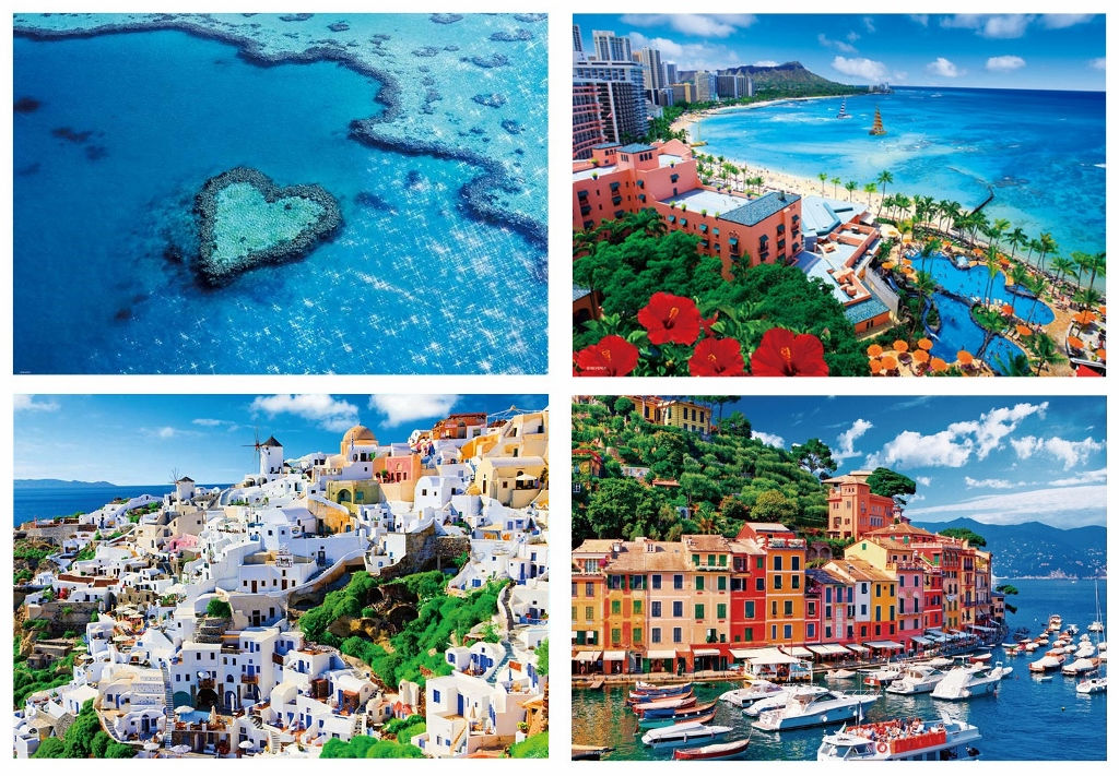こちらは海外の美しい海と海辺の街並み等を写した絵柄となっていますが、「ハートリーフ」と「エーゲ海」の絵柄のものは※手頃に作成できる300ピースパズルでありつつ完成サイズは「