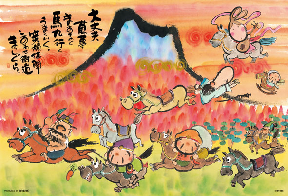 神獣とされる白馬が描かれた絵柄ということでより神話的な要素の強い絵柄になっているようですね。 「馬九行く」というのは