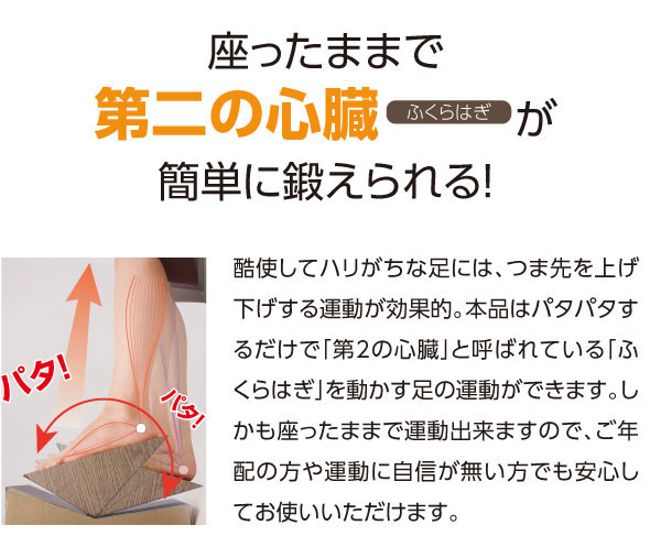 このことにより自然に足のスネとふくらはぎの筋肉が動き、それと連動する形で、もも裏やお尻にかけての筋肉も動くことで、下半身を総合的に運動させる仕組みになっています。