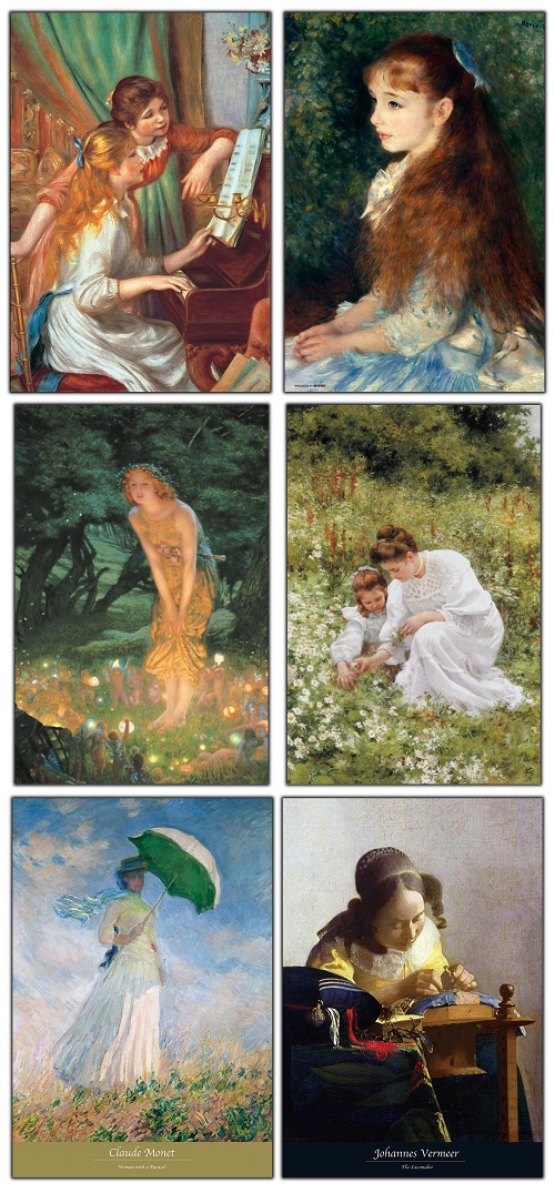 ピアノを弾く少女達|イレーヌ・カーン・ダンヴェール嬢ミッドサマーイヴ|デイジーを摘む母と子日傘の女|レースを編む女様々な女性をモデルにした絵画。 ポーズを取ったものから何気ない日常的な光景を切り取った感じのものまで、見ているとその人物の背景についてなど色々想像力を掻き立てられるものがあります。 (やはり男性の画家先生が描くのは女性の姿が多いのか、おっさん絵柄のパズルは余りない模様です。)