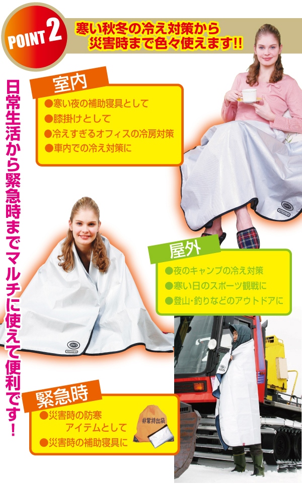 また、その高い効果を特徴としたシートでありながら、軽くて扱い易いのも大きなポイントで、就寝時の寒さ避け以外にも膝にかけたり、軽く羽織るようにして日常生活をサポートしてくれます。