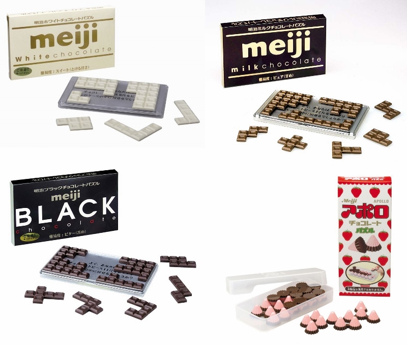 「ホワイト」「ミルク」「ブラック」のラインナップで、色々な形のチョコのピースを組み合わせて箱にピッタリと戻したり、様々な図形を作って遊んだりするゲームとなっていて、アポロチョコレートの方も上手くピースをケースに詰め込むことができたらクリアと、ルールは簡単なのですが、やりがいはありそうです。